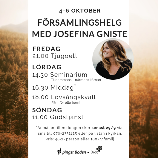 Helgen den 4-6/10 kommer Josefina Gniste och har en helg tillsammans med oss i församlingen!