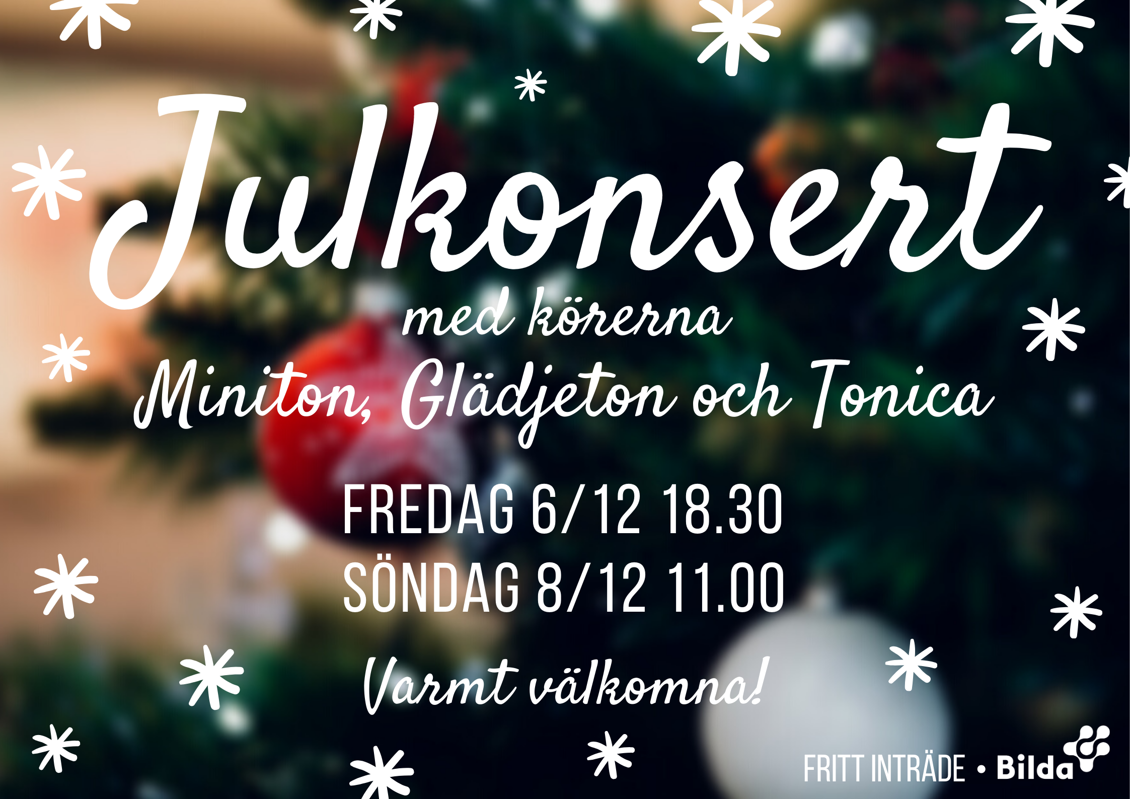 I helgen är det dags för årets julkonserter! Det kommer bli två konserter fyllda av julstämning, sång, musik och berättelsen om den första julen. En på fredagkväll klockan 18.30 och en på söndag klockan 11.00. Ta med dig en vän och kom! Varmt välkommen!