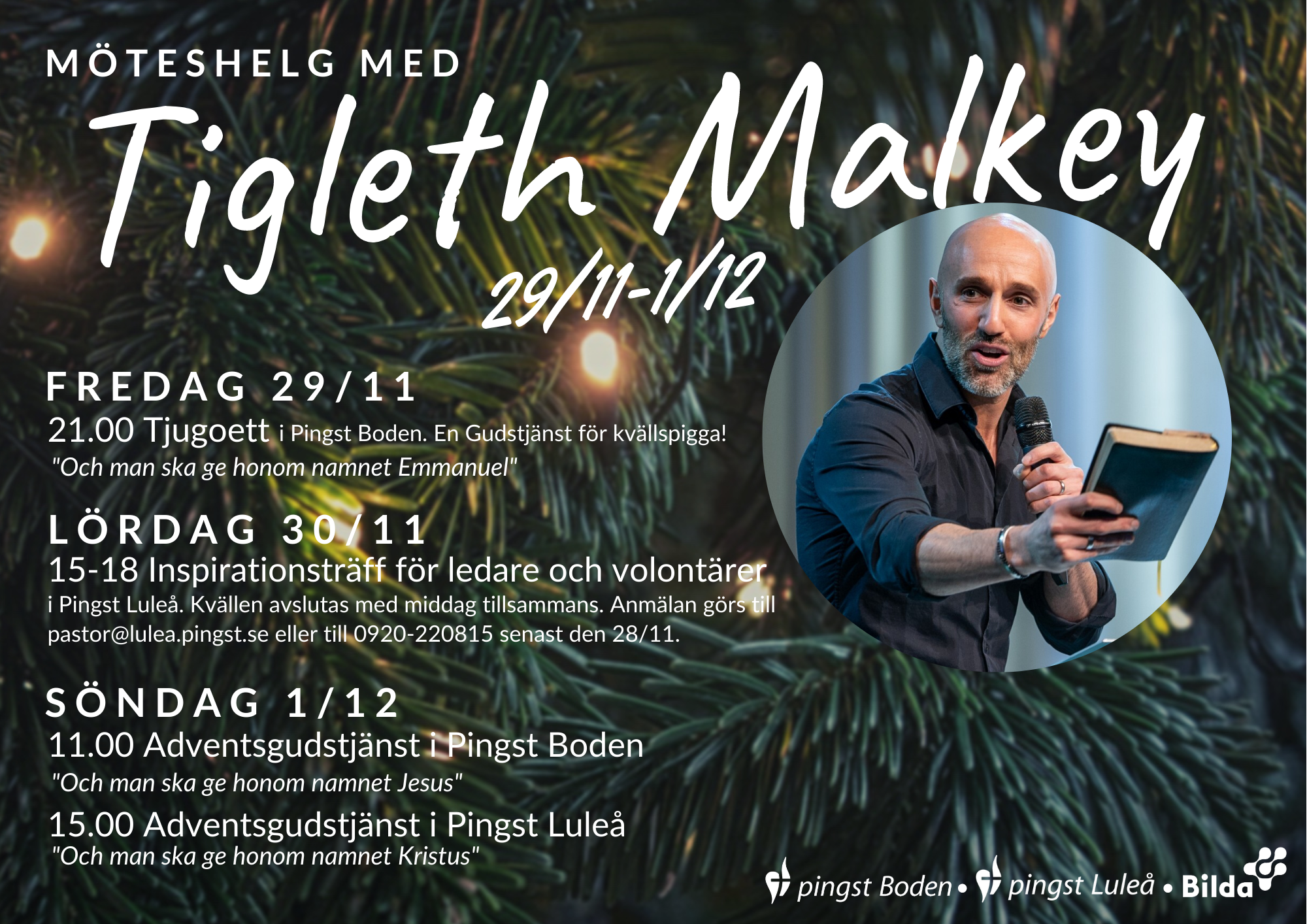 Helgen den 29/11-1/12 kommer Tigleth Malkey på besök till oss i Norrbotten! Det blir dagar fyllda av inspirerande samlingar och Gudstjänster under temat ”Och man ska ge honom namnet…” Tigleth jobbar som riksevangelist inom Pingst och reser landet runt för att sprida budskapet om Jesus och vi är så glada att han kommer hit!