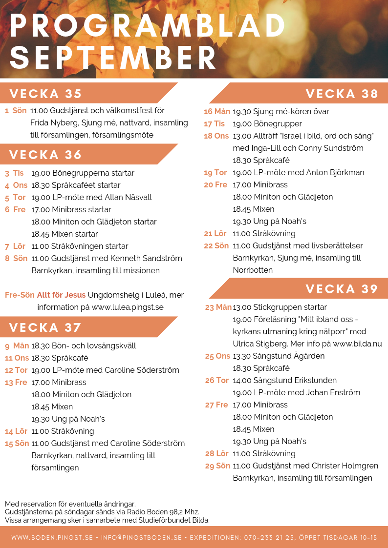 NÄR? Måndag den 23/9 klockan 19.00-21.15 i Pingstkyrkan Boden.