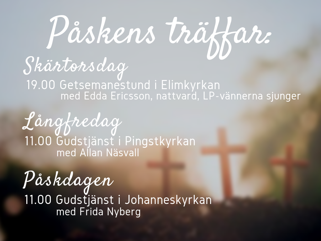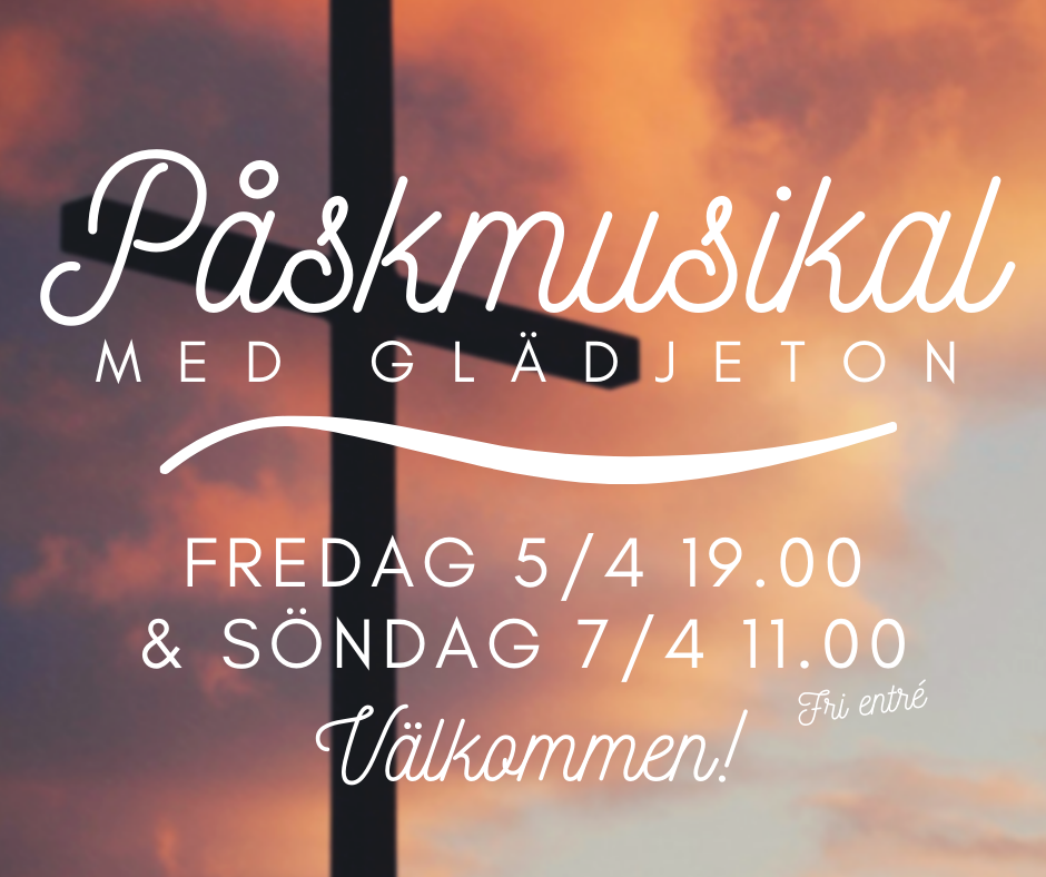PÅSKMUSIKAL Publicerat 18 mars, 2019 av Elvira Hemström I år har vi den stora glädjen att få bjuda in till en musikal med påskens budskap i centrum. Medverkar gör barnkören Glädjeton mfl. Fri entré. Varmt välkommen!
