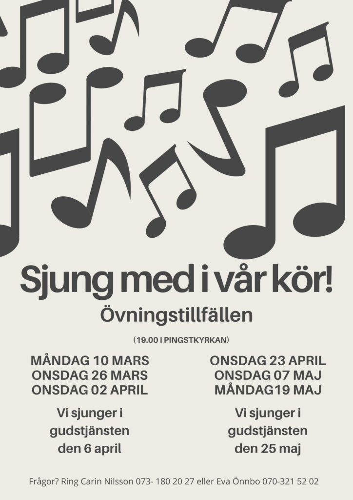 KÖRÖVNING Publicerat 22 april, 2025 av Caroline Kom och var med och sjung i våran kör!Kören övar kl 19.00: Onsdag 23/4, Onsdag 7/5 och Måndag 19/5 och sjunger sedan i vår gudstjänst söndag 25/5 kl 11.00.