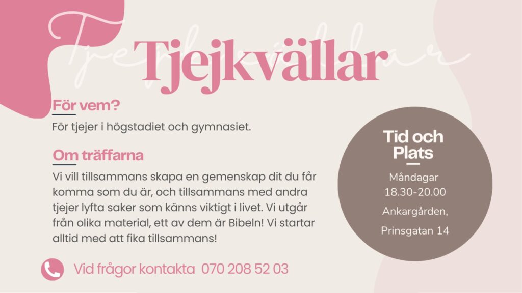 Är du tjej och går på högstadiet eller gymnasiet är du varmt välkommen till våra tjejkvällar på Ankargården. Vi träffas varje måndag kl 18.30. Vi fikar tillsammans och samtalar om livets frågor och om tro. Du behöver inte vara van kyrkobesökare för att vara med, utan det räcker med att du är nyfiken! Hoppas att vi ses!