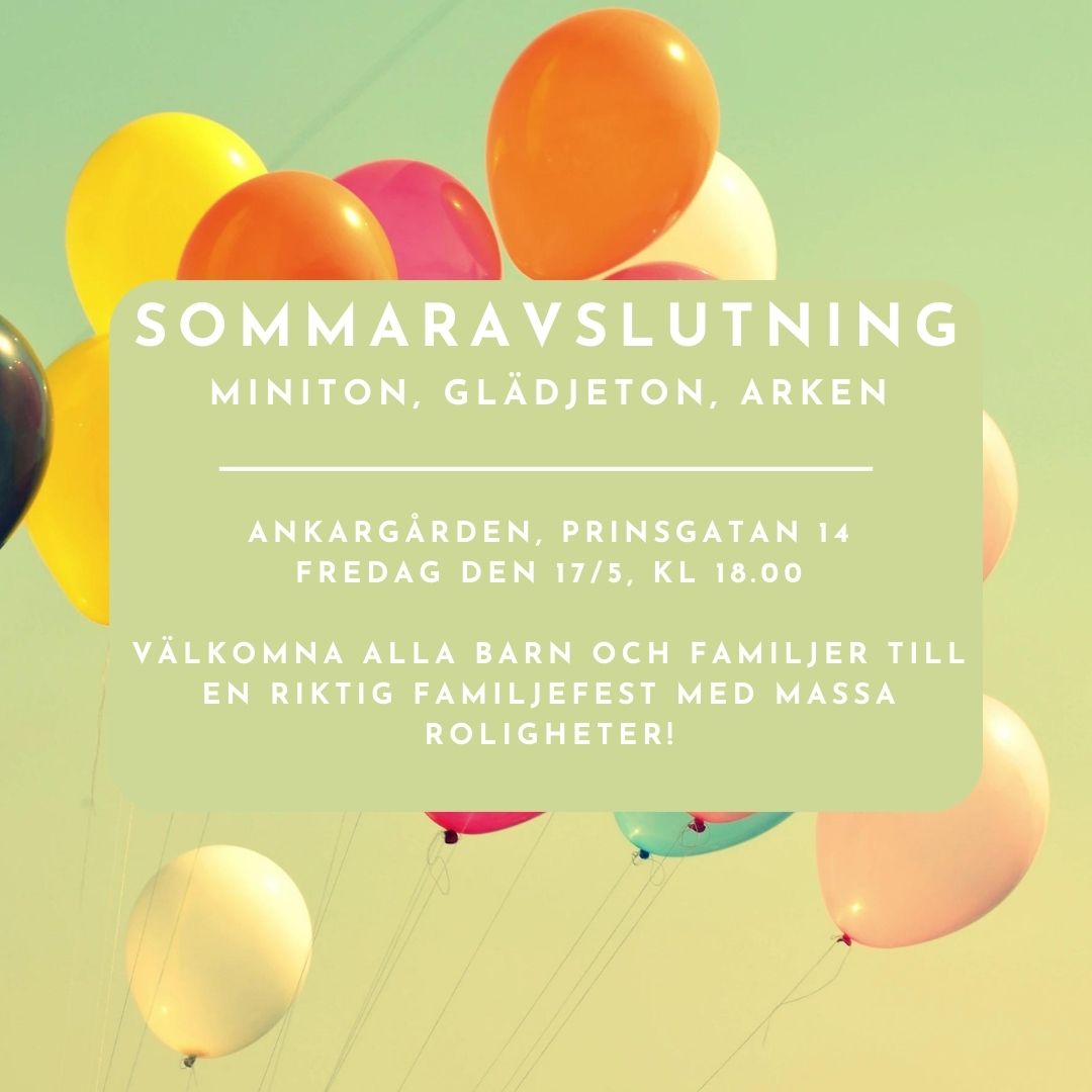 Fredag den 17/5, kl 18.00 är det avslutning för barnkörerna Miniton & Glädjeton samt för barnen som varit med på Arken. Det blir en familjefest på Ankargården med en massa roligheter tillsammans med alla barn, syskon och familjer. Varmt välkomna att vara med då!