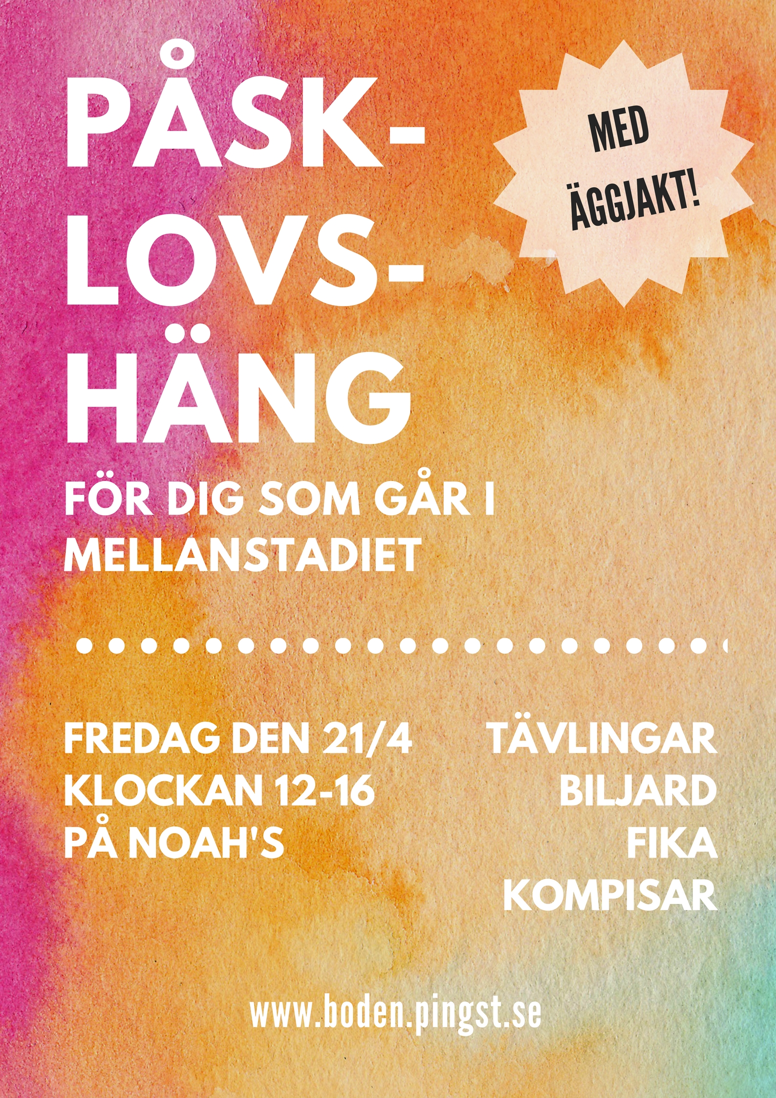 Under påsklovet kommer det inte att vara någon barnkör eller någon MIX, det sätter igång den 28/4 igen! MEN, för alla barn i mellanstadiet så kommer det att bli PÅSKLOVSHÄNG. Fredagen den 21/4 mellan 12-16 på Noah’s kommer det att finnas fika, spel och en klurig äggjakt! Så, varmt välkommen!