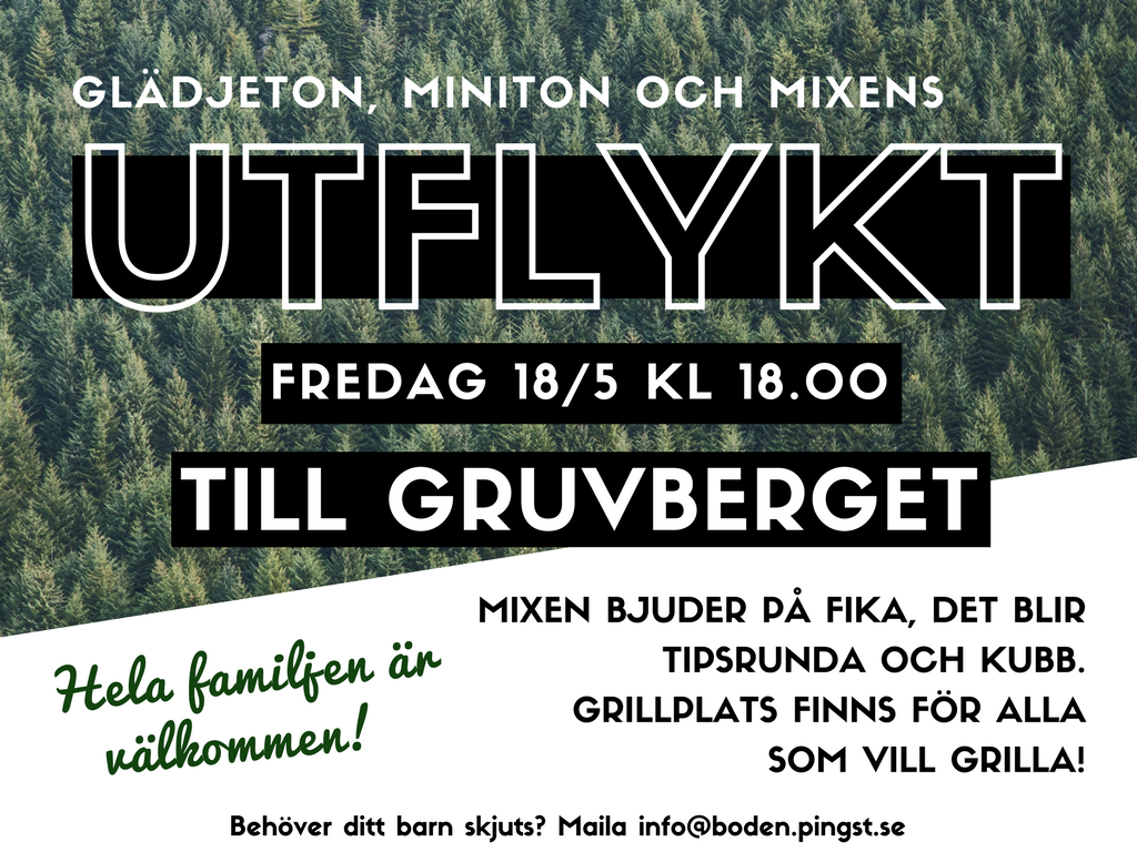 ALLA FÖRÄLDRAR, SE HIT! ? Nu på fredag har vi våravslutning för barngrupperna med utflykt till toppen av Gruvberget. Dit får man komma med hela familjen, Mixen har gjort fika och det blir tipsrunda och lekar! Vill man grilla så kan man ta med sig det också. Välkommen!